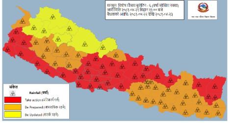 सोमबार दिउँसो विशेष बुलेटिन जारी गरी महाशाखाले साउन २२ २३ गते कोशी प्रदेश, बागमती प्रदेश, गण्डकी प्रदेश, लुम्बिनी प्रदेश र सुदूरपश्चिम प्रदेशका केही तथा कर्णाली प्रदेश र मधेश प्रदेशका थोरै स्थानहरूमा भारी देखि धेरै भारी वर्षाको सम्भावना रहेको जनाएको छ ।