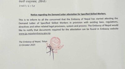 जापान । जापानमा निश्चित सीपयुक्त श्रमिकको मागपत्र प्रमाणीकरण सुरू भएको छ । नेपाली राजदूतावास जापानले एक विज्ञप्ति जारी गर्दै प्रचलित कानून, नियमावली, निर्देशिका तथा अन्य सम्बन्धित कानूनी प्रावधान, प्रणाली र प्रक्रियाअनुसार निश्चित सीपयुक्त श्रमिकको मागपत्र प्रमाणीकरण गर्ने कार्य सुरु गरेको उल्लेख गरेकाे छ ।