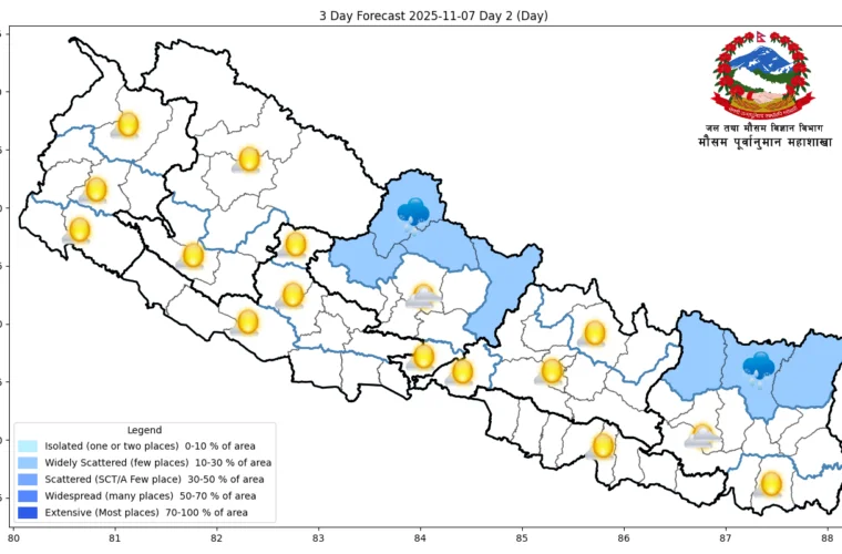 अधिकांश भागमा मौसम सफा,कोशी र गण्डकीका हिमाली भागमा हल्का वर्षा र हिमपातको सम्भावना